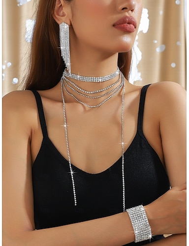 Ensemble de bijoux en strass pour femme, 5 pièces, collier ras du cou en cristal scintillant, longues boucles d'oreilles &bracelet pour bals de soirée glamour &événements festifs
