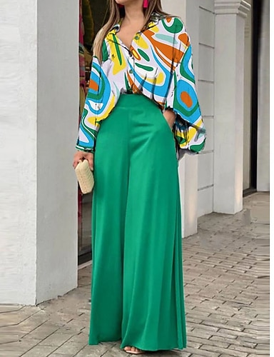 Femmes Chemise Chemisier Pantalons à Jambes Larges manche longue Col de chemise Uni Imprimé Mode Streetwear Quotidien Occasionnel Quotidien Vert Printemps & Automne Coupe régulière