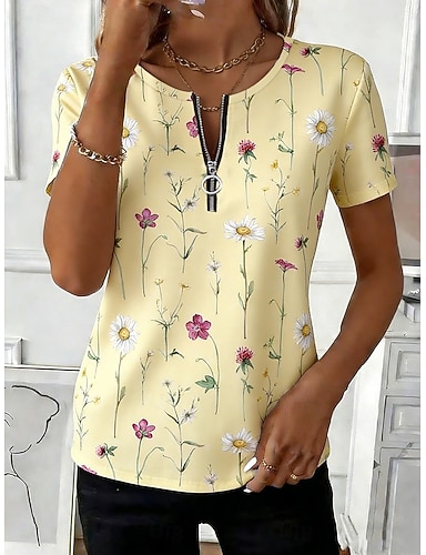 Femmes T-shirt Fermeture éclair Fleuri Graphique Plantes Élégant Occasionnel Manche Courte Col ras du cou Hauts Réguliers Quotidien Sports Week-end Bleu Jaune Rose Claire Violet Vert Été Printemps