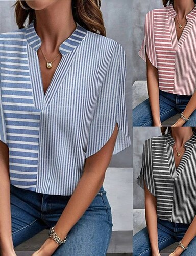 Femmes Chemise Chemisier Patchwork Rayé Élégant Vacances Manche Courte Col en V Hauts Longs Quotidien Fête Sortir Rose Claire Bleu Roi Été Printemps