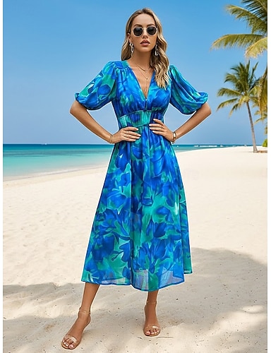 Femmes Robe Midi Robe trapèze Vacances Occasionnel Extérieur Sortir Coupe régulière Fleuri Manche Courte Col en V Bleu Été Printemps
