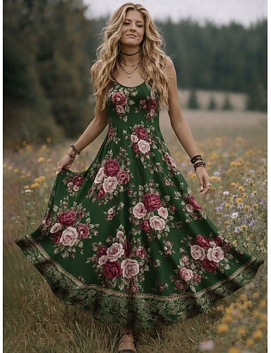 Femmes Robe maxi Robe bohème Robe Vintage Robe Décontractée ancien Quotidien Extérieur Plage Coupe Ample Fleuri Graphique manche longue Col en V Vert Été Printemps Automne