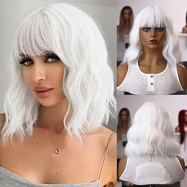 Perruque Synthétique Ondulé Boucle Lâche Raie au milieu Frange Droite Perruque 12 pouces Blanche Cheveux synthétiques 12 pouce Femmes Doux Blanc