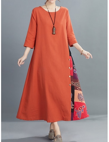 Robe maxi en lin pour femme faux coton robe décontractée coupe ample graphique floral manches 3/4 col rond noir jaune rouge violet été printemps
