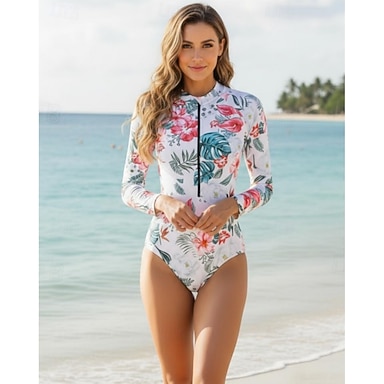 Femmes Maillot Anti UV Maillot de bain à imprimé floral Maillot de bain Tropical Zip Up Ultra Léger (UL) Protection UV Élastique manche longue Maillot de Bain Surf Plongée en apnée Printemps