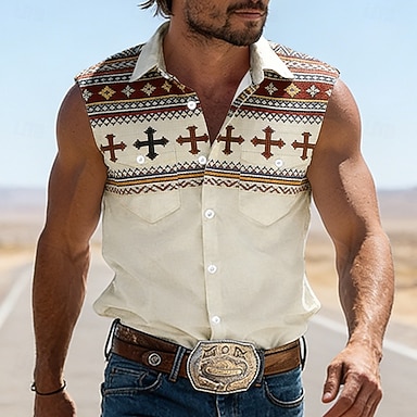 Homme Croix Ethnique Blocage de couleurs Chemise Western Chemise de cow-boy T-shirt sans manches Sans manches ancien Style Western Extérieur Vacances Été Printemps Col Rabattu Impression 3D Chemises
