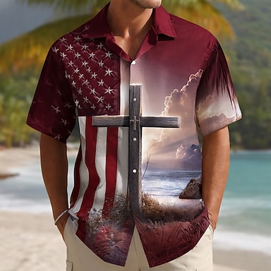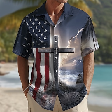 Homme 4 juillet, 250e anniversaire des États-Unis Croix Drapeau américain Chemise Chemise à col cubain Chemise Boutonnée Manche Courte Patriotique Fête Été Printemps Chemise à col camp Impression 3D