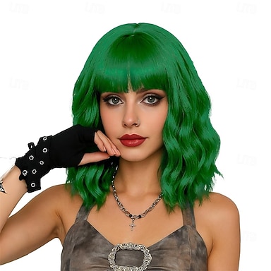 perruque verte avec frange perruques longues et ondulées douces pour femmes perruque de remplacement de fibre synthétique bouclée costumes d'Halloween perruques de fête cosplay perruques de la