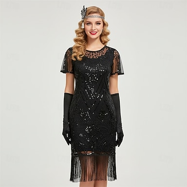 Set Années Folles Années 1920 Mi-long Court Robe Charleston Tenues Costume de fête avec accessoires Manche illusion Manches courtes Gatsby le Magnifique Invité au mariage Paillettes Frange à pompons