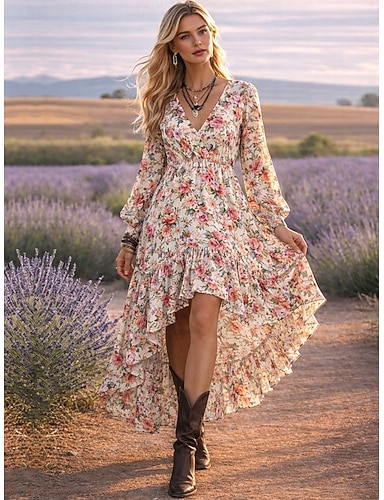 Femmes Robe Longue Maxi Robe Robe trapèze Robe Fleurie Élégant Mode Moderne Quotidien Extérieur Vacances Coupe régulière Fleuri manche longue Col en V Rouge Marron Printemps Automne