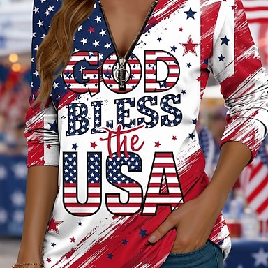 Jour de l'Indépendance Américaine Femmes T-shirt Fermeture éclair Graphique Drapeau Américain Élégant Classique Occasionnel Manche Courte Col ras du cou Hauts Réguliers Quotidien Week-end Bleu
