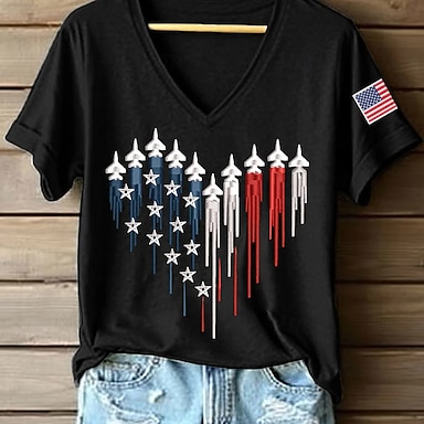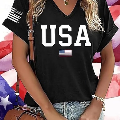 Jour de l'Indépendance Américaine Femmes T-shirt Imprimé Graphique Drapeau ancien Élégant Classique Manche Courte Col en V Hauts Réguliers Quotidien Frêne Noir Blanche Été Printemps