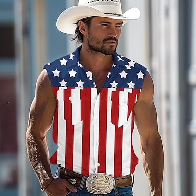 Jours de l'Indépendance Chemise patriotiques pour hommes avec drapeau américain chemise western chemise de cowboy sans manches mode décontractée vacances été printemps col rabattu avant deux