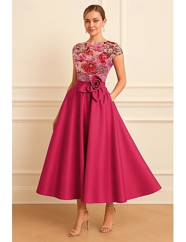 Ligne A Longueur thé Robes de Cocktail Élégant Floral Manche Courte Col Bateau Fête de jardin Mariage Poche Satin avec Imprimé floral