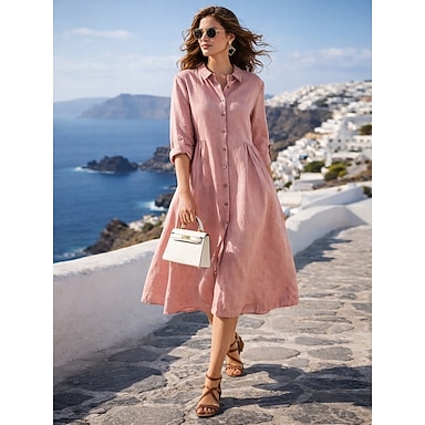 Femmes Robe Midi Faux coton lin Robe Chemise Robe Décontractée Robe trapèze Mode Moderne Quotidien Vacances Sortir Coupe régulière Uni manche longue Col de chemise Rose Claire Printemps Automne