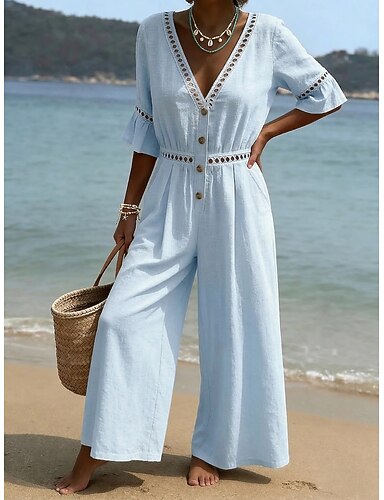 Femmes Normal Combinaison Actif Couleur Unie Demi Manches Jambe large Col en V Quotidien Plage Coupe régulière Bleu Noir Rose Claire Été