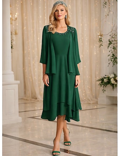 Deux Pièces Ligne A Longueur thé Robe d'invité de mariage Robe de Mère de Mariée Manche 3/4 Bijoux Élégant robe demoiselle d honneur Fête de fiançailles Chiffon avec Perlage