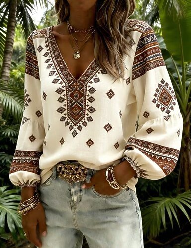 Femmes Chemise Fleuri Graphique Géométrique Bohème Vacances ancien manche longue Col en V Hauts Longs Occasionnel Quotidien Fête Bordeaux Noir Violet Beige Été Printemps