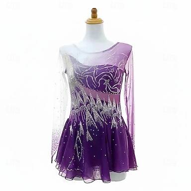 Robe de patinage artistique Femmes Patinage Robe Violet Patchwork Ourlet asymétrique Spandex Maille Haute Élasticité Entraînement Compétition Tenue de Patinage Classique cristal pailleté manche longue