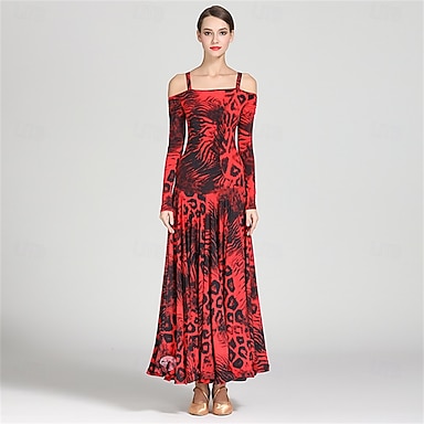 Robe de danse de salon à épaules dénudées et imprimé animal pour femmes - Robe trapèze à manches longues pour compétitions, danses latines et événements de danse