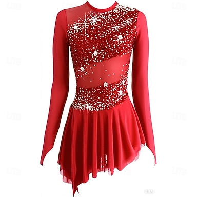 Robe de patinage artistique Femmes Fille Patinage Robe Rose Ourlet asymétrique Maille Haute Élasticité Entraînement Compétition Tenue de Patinage Classique cristal pailleté manche longue Patinage sur