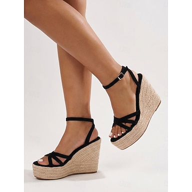 Espadrilles compensées noires à brides pour femmes - sandales à plateforme confortables en jute pour les vacances à la plage et les fêtes d'été en plein air &tenues bohèmes pour croisière