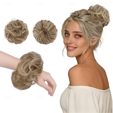 Lot de 2 petits chignons décoiffés pour cheveux fins, femmes et filles, mini chouchous élastiques synthétiques ondulés pour chignon haut.