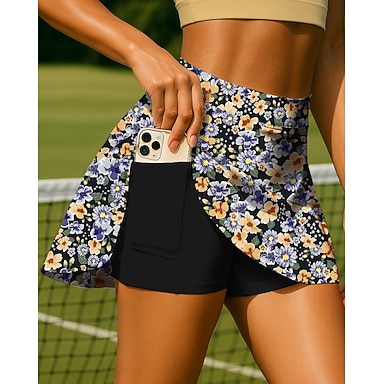 Femmes Unisexe Plantes Floral Motif Floral Jupe décontractée Jupes de tennis Patchwork Avec Poches 2 en 1 UPF50+ Résistant aux UV Multicouches Volley-ball Tennis Badminton Shorts Jupe Noir jaune.