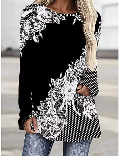 Femmes T-shirt Imprimé Fleuri Graphique À pois ancien Élégant Classique manche longue Col ras du cou Col rond Hauts Réguliers Quotidien Blanc / Noir Noir Blanche Printemps Automne