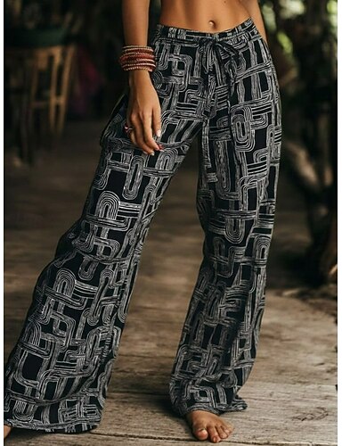 Femmes Jambe large Pantalon d'été Pantalons Vacances Streetwear Occasionnel Longueur complète Taille moyenne Graphique Géométrique Cordon de serrage Avec Poches Impression Confortable Non Elastique