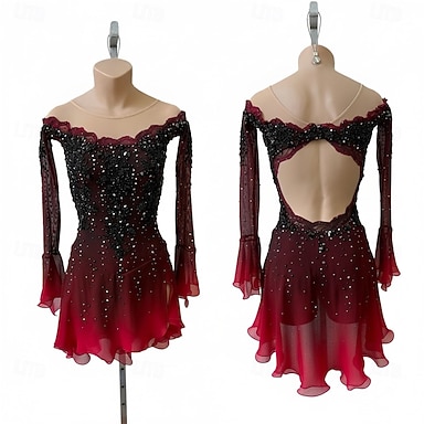 Robe de patinage artistique Femmes Patinage Robe Rouge Bordeaux Patchwork Dos Nu Élastique Entraînement Compétition Tenue de Patinage Classique cristal pailleté manche longue Patinage sur glace