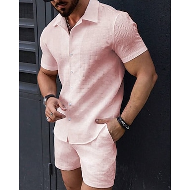 Homme Ensembles T-shirt Tenues 2 pièces Ensemble Short Manche Courte Revers Été Uni Mode Occasionnel 2 pièces Jacquard Vacances Tenue quotidienne Sortir Noir Blanche Rose Claire T-shirt haut de gamme