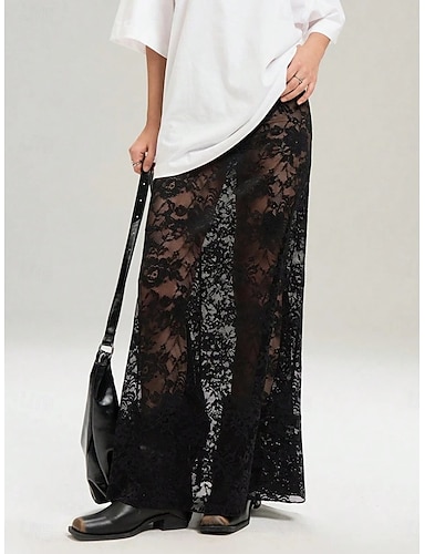 Femmes Jupe en dentelle Élégant ancien Sexy Longue Maxi Taille Moyenne Jupes Dentelle A Volants Patchwork Non Elastique Quotidien Vacances Noir Printemps, Automne, Hiver, Été Nylon