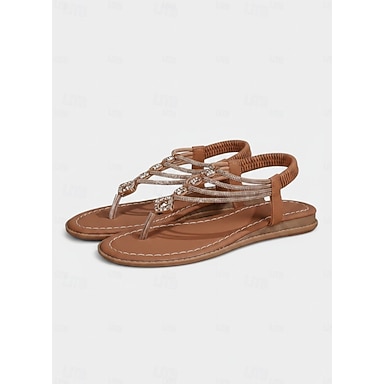 Sandales bohèmes marron à strass pour femmes, brides en T avec dos élastique, élégantes chaussures plates d'été pour les sorties décontractées, les sorties à la plage et les voyages de vacances