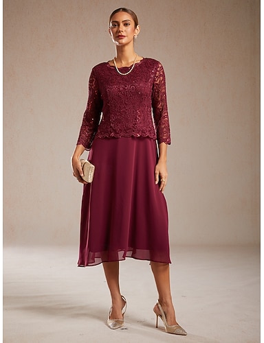 Femmes Robe Midi Robe trapèze Élégant Soirée robe demoiselle d honneur Dentelle Coupe régulière Couleur Unie Manche 3/4 Col ras du cou Vin