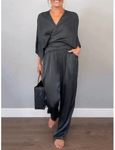 Femmes Ensembles de Pantalons Haut boléro Manche 3/4 Col en V Couleur Unie Découpé Mode Streetwear Occasionnel Quotidien Extérieur Bleu Fuchsia Kaki Été Coupe régulière