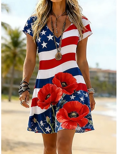 Jour de l'Indépendance Américaine Femmes Mini Robe Robe d'Été Robe T-Shirt Robe trapèze Vacances Occasionnel Boho Plage Coupe régulière Fleuri Graphique Drapeau Manche Courte Col en V Bleu Rouge Ét