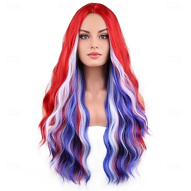 Perruque du 4 juillet pour femmes longue bouclée rouge blanche et bleue perruques de costume pour la fête de l'indépendance fête cosplay