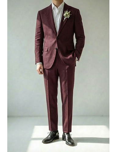 Pour des hommes Smoking Costumes en lin Mariage à la plage Mariage de printemps Rouge Bordeaux bleu marine Printemps & Été Costume / Tailleur Revers Cranté Mode Léger Couleur Unie Coupe Slim 2 pièces
