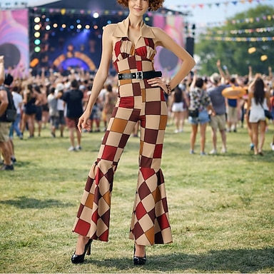 Set Rétro Vintage Années 1970 Ceinture Taille Combinaison Sans manches Hippie Disco Quadrillé / Guingan Déguisement Femmes Halloween Carnaval Festival de Musique Soirée à thème rétro Adulte Ceinture