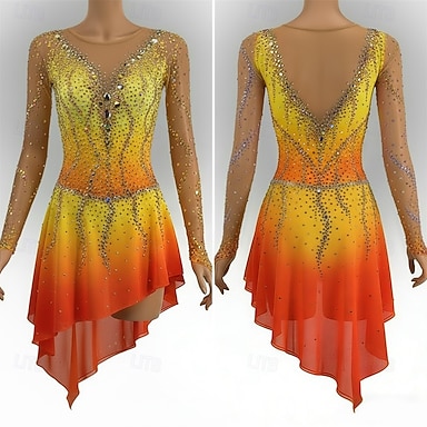 Robe de patinage artistique Femmes Patinage Robe Jaune Patchwork Dos Nu Élastique Entraînement Compétition Tenue de Patinage Classique cristal pailleté manche longue Patinage sur glace Patinage