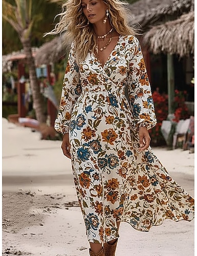Robe midi femme Robe en A Vacances Décontractée Boho Plage Ajustement régulier Graphique Abstrait Manches longues Col en V Blanc Rouge sombre Vin Marron Printemps Automne Hiver