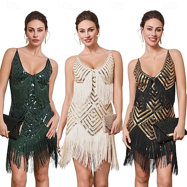 Années Folles Années 1920 Mi-long Robe Charleston Sans manches Gatsby le Magnifique Paillettes Frange Col en V Déguisement Femmes Noël Carnaval Mascarade Soirée à thème rétro Danse Charleston Adulte