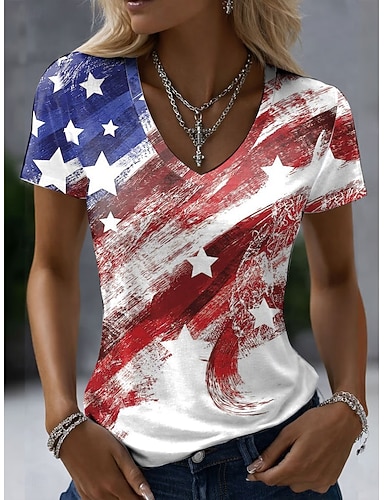 Jour de l'Indépendance Américaine Femmes T-shirt Imprimé Graphique Drapeau Américain ancien Élégant Classique Manche Courte Col en V Hauts Réguliers Quotidien Bleu Blanche Gris anthracite Rouge et