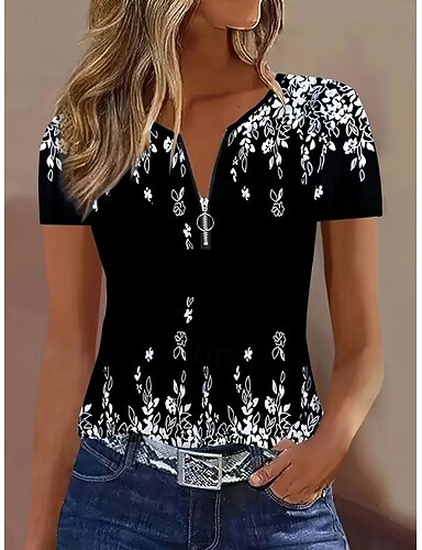 Femmes T-shirt Quart de zip Fleuri Graphique Plantes Tropical Hawaïen Élégant Manche Courte Col ras du cou Hauts Réguliers Quotidien Sports Sortir Noir Rose Été Printemps