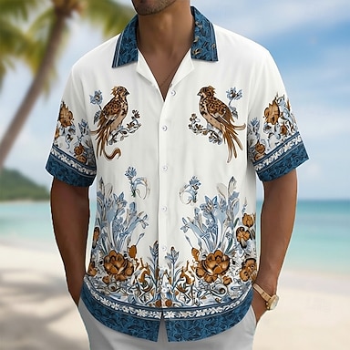 Homme Oiseau Imprimé Floral Fleurs tropicales Chemise Chemise à col cubain Chemise hawaïenne Manche Courte Hawaïen Vacances Fête Tenue de plage Été Printemps Chemise à col camp Impression 3D Bleu Vert