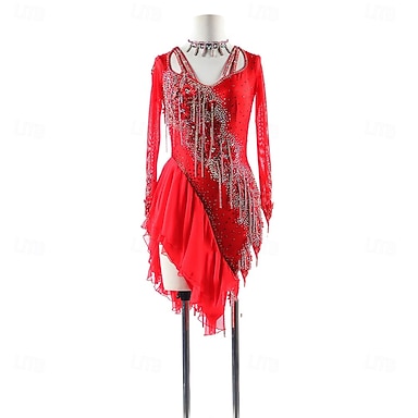 Robe de patinage artistique pour femmes et filles, rouge, dos ouvert, ourlet asymétrique, maille, haute élasticité, entraînement, compétition, vêtements de patinage, classique, cristal/strass, manches