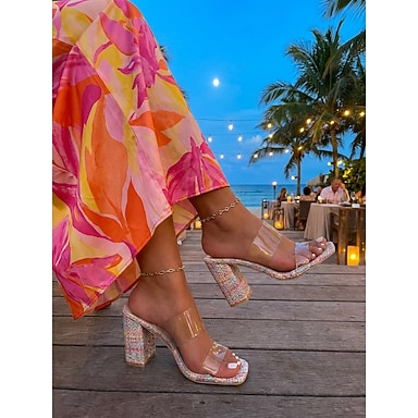 sandales à talons compensés à brides transparentes pour femmes – chaussures à enfiler transparentes chics à bout ouvert avec semelle tissée colorée pour l'été, les fêtes et les sorties à la plage