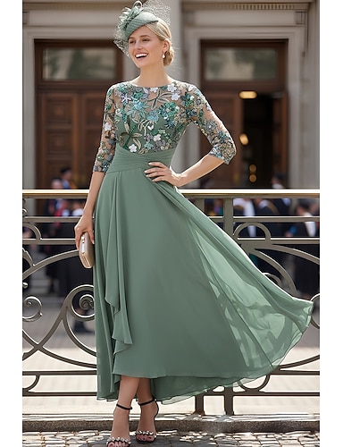 Ligne A Robe Robe haute-basse Longueur cheville Robe de Cocktail Robe d'invité de mariage Robe de Mère de Mariée Demi Manches Col Rond Élégant Occasionnel Asymétrique Formel Chiffon avec Broderie