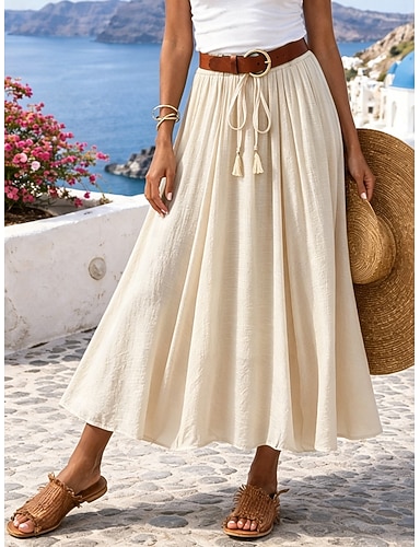 Femmes Jupe de vacances Jupe en faux coton et lin Mode Occasionnel Maxi Taille haute Jupes Uni Plissé Non Elastique Quotidien Vacances Bleu Noir Rose Claire Kaki Été Polyester
